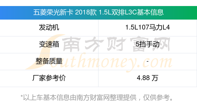 五菱榮光新卡 2018款 1.5L雙排L3C動力上搭載的是一臺1.5L107馬力L4自然吸氣發(fā)動機,匹配5擋手動擋變速箱,燃料形式為汽油,廠家參考價4.88萬元。