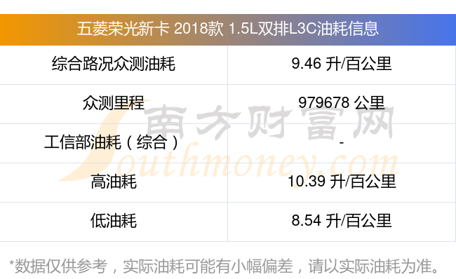 根據(jù)多位車主實測得出數(shù)據(jù),該車型低油耗為8.54L/100km,高油耗為10.39L/100km,綜合路況眾測油耗為9.46L/100km,工信部綜合油耗為-L/100km。