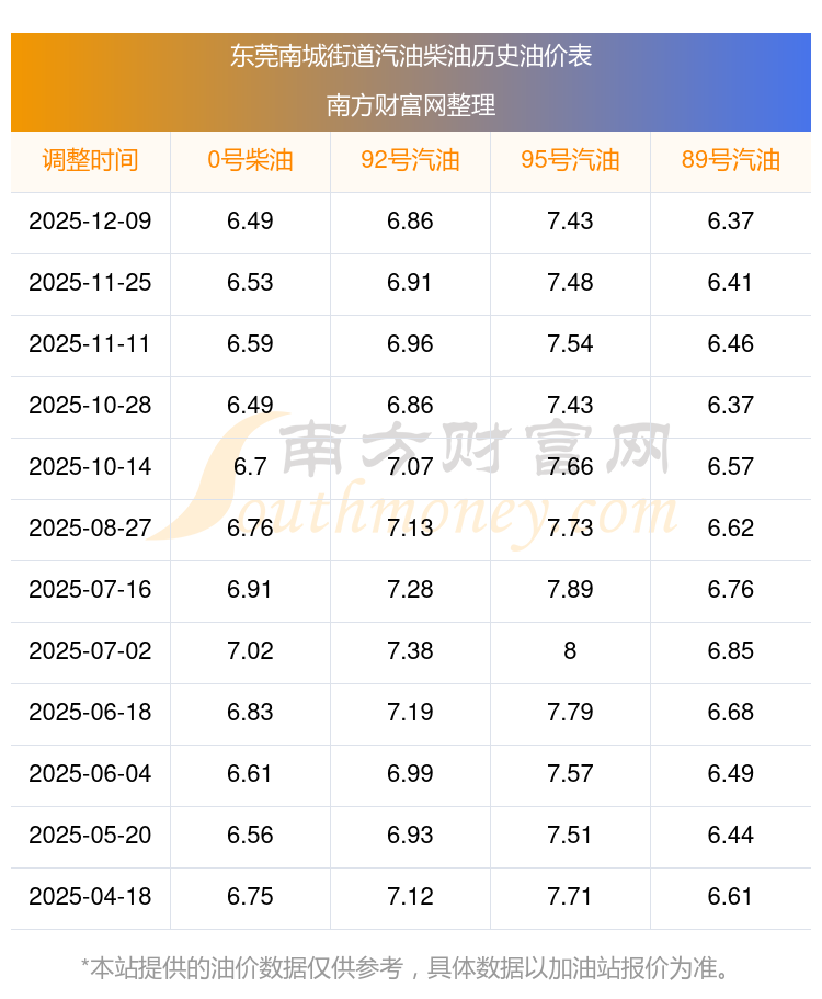 東莞南城街道汽油、柴油12月18日每升最新價格為:92號汽油為6.86元;95號汽油為7.43元;89號汽油為6.37元;0號柴油為6.49元,調(diào)整時間為12月9日。