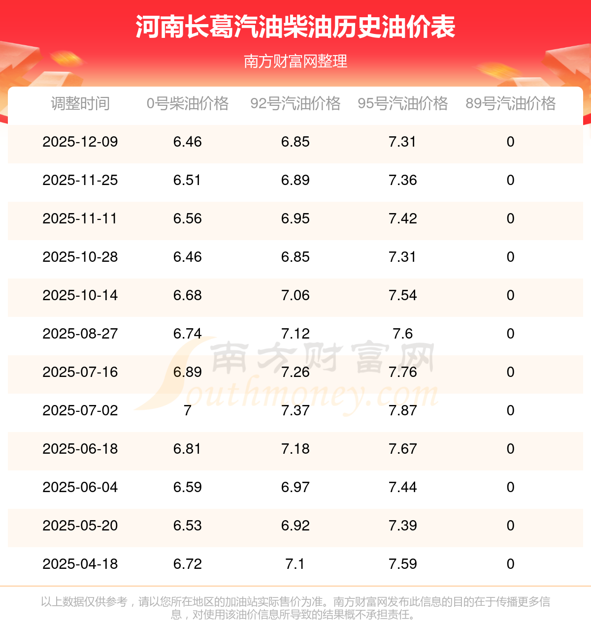 12月18日,河南長(zhǎng)葛汽油、柴油每升的價(jià)格為12月9日調(diào)整后的價(jià)格,具體為:92號(hào)汽油為6.85元,跌了0.04元,跌幅達(dá)0.58%;95號(hào)汽油為7.31元,跌了0.05元,跌幅達(dá)0.68%;0號(hào)柴油為6.46元,跌了0.05元,跌幅達(dá)0.77%。