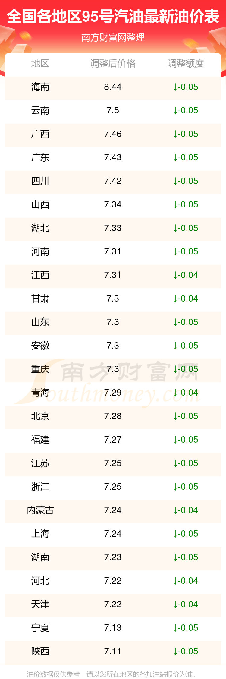 全國(guó)各地區(qū)最新95號(hào)汽油油價(jià)表