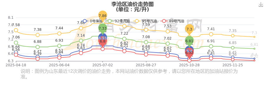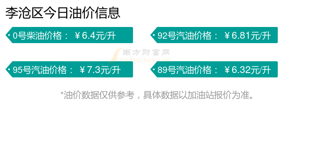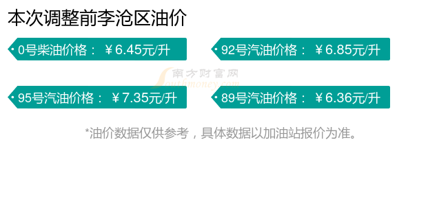 12月18日李滄區(qū)汽油、柴油的價格是12月9日調(diào)整后的價格,每升價格為:92號汽油為6.81元,下降了0.04元,下降幅達(dá)0.58%;95號汽油為7.3元,下降了0.05元,下降幅達(dá)0.68%;89號汽油為6.32元,下降了0.04元,下降幅達(dá)0.63%;0號柴油為6.4元,下降了0.05元,下降幅達(dá)0.78%。