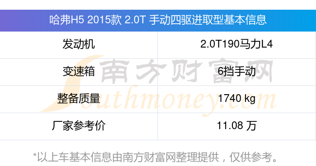 哈弗H5 2015款 2.0T 手動四驅(qū)進(jìn)取型動力上搭載的是一臺2.0T190馬力L4渦輪增壓發(fā)動機(jī),匹配6擋手動擋變速箱,燃料形式為汽油,常規(guī)整備質(zhì)量1740kg,廠家參考價11.08萬元。