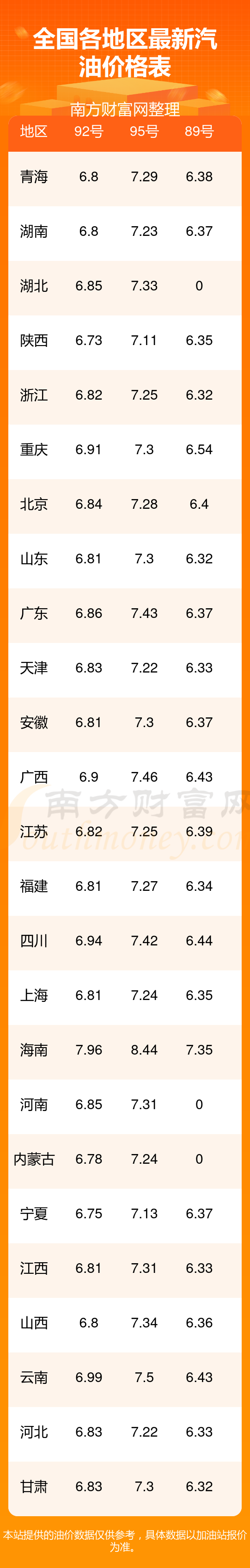 以上數(shù)據(jù)僅供參考,請以您所在地區(qū)的加油站實際售價為準(zhǔn)。南方財富網(wǎng)發(fā)布此信息的目的在于傳播更多信息,對使用該油價信息所導(dǎo)致的結(jié)果概不承擔(dān)責(zé)任。