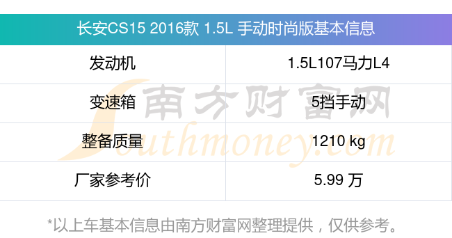 在動(dòng)力方面,長(zhǎng)安CS15 2016款 1.5L 手動(dòng)時(shí)尚版搭載的是一臺(tái)1.5L107馬力L4自然吸氣發(fā)動(dòng)機(jī),匹配5擋手動(dòng)擋變速箱,燃料形式為汽油,常規(guī)整備質(zhì)量1210kg,廠家參考價(jià)5.99萬(wàn)元。