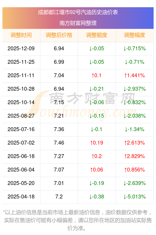 成都都江堰市92號汽油歷史油價(jià)一覽表