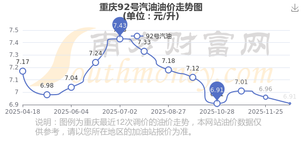 12月18日,重慶92號汽油的價格是6.91元每升,本次的調(diào)整時間為12月9日,對比上次的調(diào)整減了0.05元,減0.718%,下次調(diào)整時間為12月22日24時,還有4.61天。