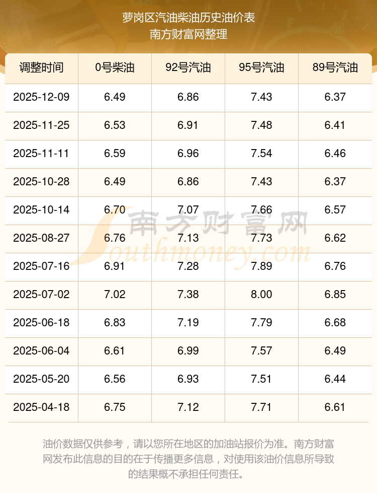 12月18日,蘿崗區(qū)汽油、柴油每升最新價格為(12月9日調(diào)整后的價格):92號汽油為6.86元,減了0.05元,減幅達0.72%;95號汽油為7.43元,減了0.05元,減幅達0.67%;89號汽油為6.37元,減了0.04元,減幅達0.62%;0號柴油為6.49元,減了0.04元,減幅達0.61%。