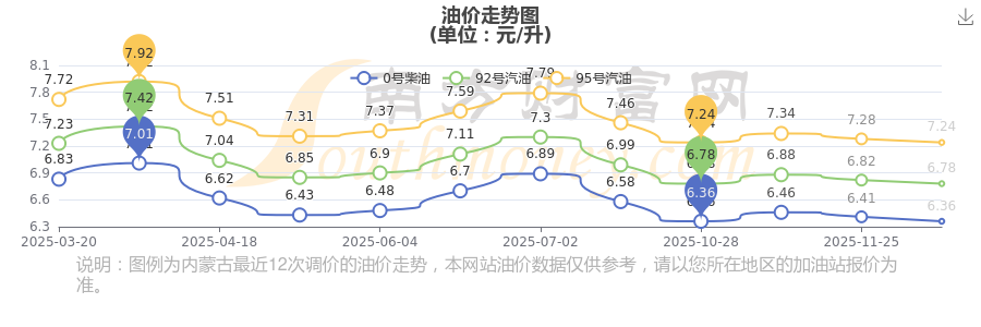 12月18日內(nèi)蒙古赤峰92號汽油的最新價格(12月9日調(diào)整后的價格):6.78元/升,相對上次調(diào)整下跌了0.04元。下一輪油價調(diào)整時間12月22日24時,距離現(xiàn)在還有4.6天。
