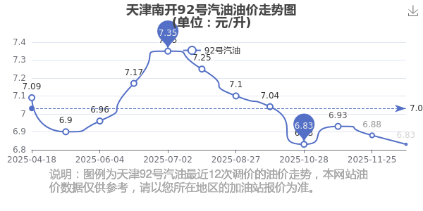 12月18日天津南開92號汽油的價(jià)格為6.83元/升,這是12月9日調(diào)整后的價(jià)格,相對上次調(diào)整時(shí)間11月25日的油價(jià)6.88元每升,下降了0.05元,下降幅達(dá)0.727%。