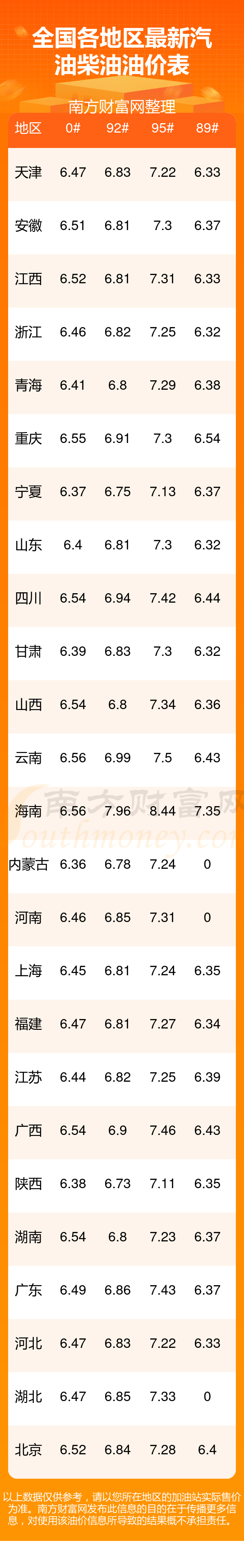 全國(guó)89號(hào)汽油最新平均價(jià)格為:6元每升,其中,最低為浙江,價(jià)格為6.32元/升,最高為海南,價(jià)格為7.35元/升。