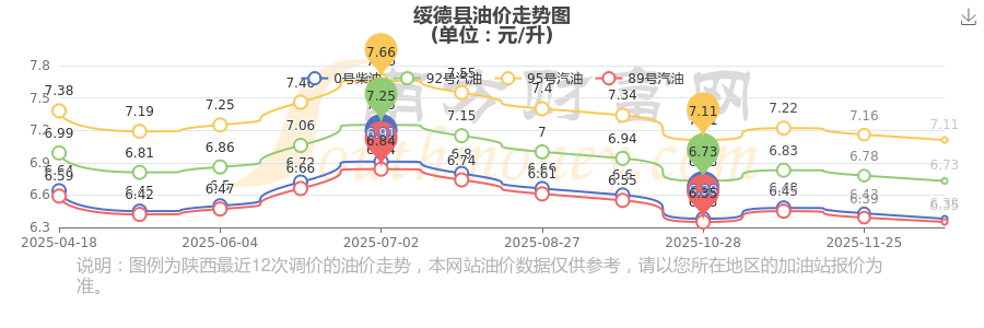 綏德縣汽油、柴油12月18日每升的價格為:92號汽油6.73元;95號汽油7.11元;89號汽油6.35元;0號柴油6.38元,本次油價調(diào)整時間是12月9日。