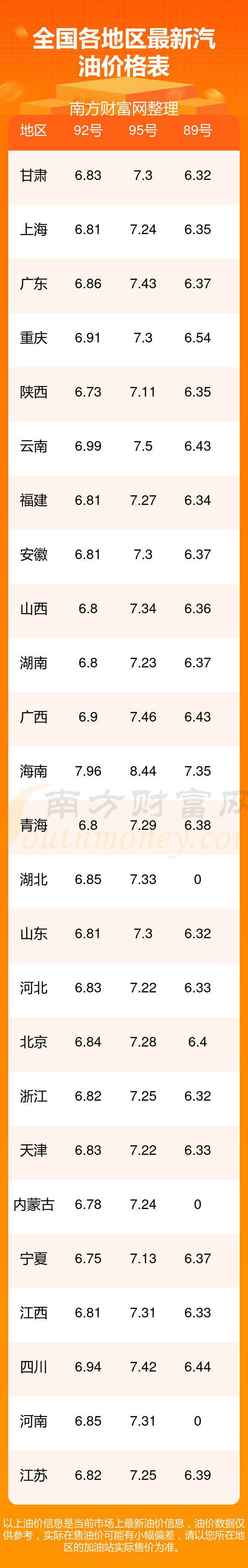 92號汽油平均價格:7元每升,其中,最高為海南,價格為7.96元/升,最低為陜西,價格為6.73元/升。