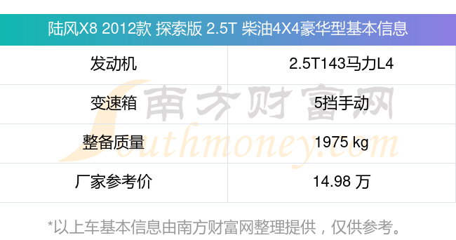 陸風(fēng)X8 2012款 探索版 2.5T 柴油4X4豪華型動力方面,搭載的是一臺2.5T143馬力L4渦輪增壓發(fā)動機(jī),匹配5擋手動擋變速箱,燃料形式為柴油,常規(guī)整備質(zhì)量1975kg,廠家參考價14.98萬元。