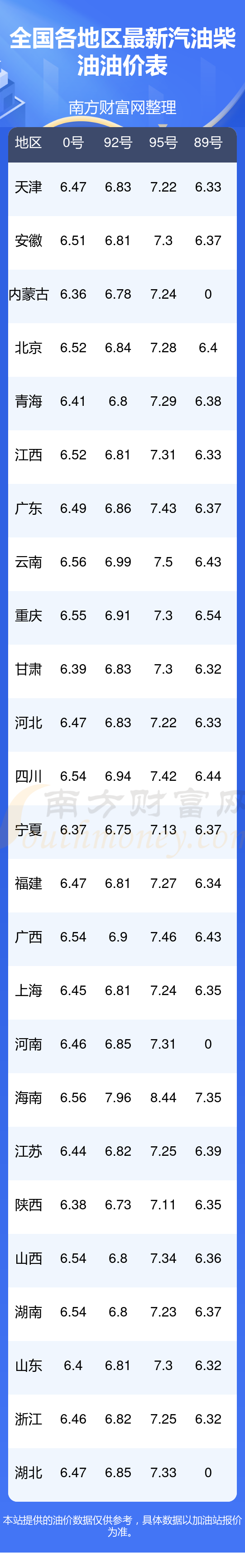 95號汽油平均價格:7元每升,其中,最高為海南,價格8.44元/升,最低為陜西,價格7.11元/升。