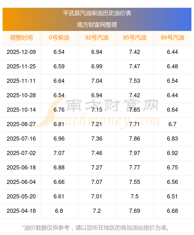 平武縣汽油、柴油12月18日每升的價格是多少?具體為:92號汽油為6.94元,下跌了0.05元;95號汽油為7.42元,下跌了0.05元;89號汽油為6.44元,下跌了0.04元;0號柴油為6.54元,下跌了0.05元,本輪油價的調(diào)整時間為12月9日。