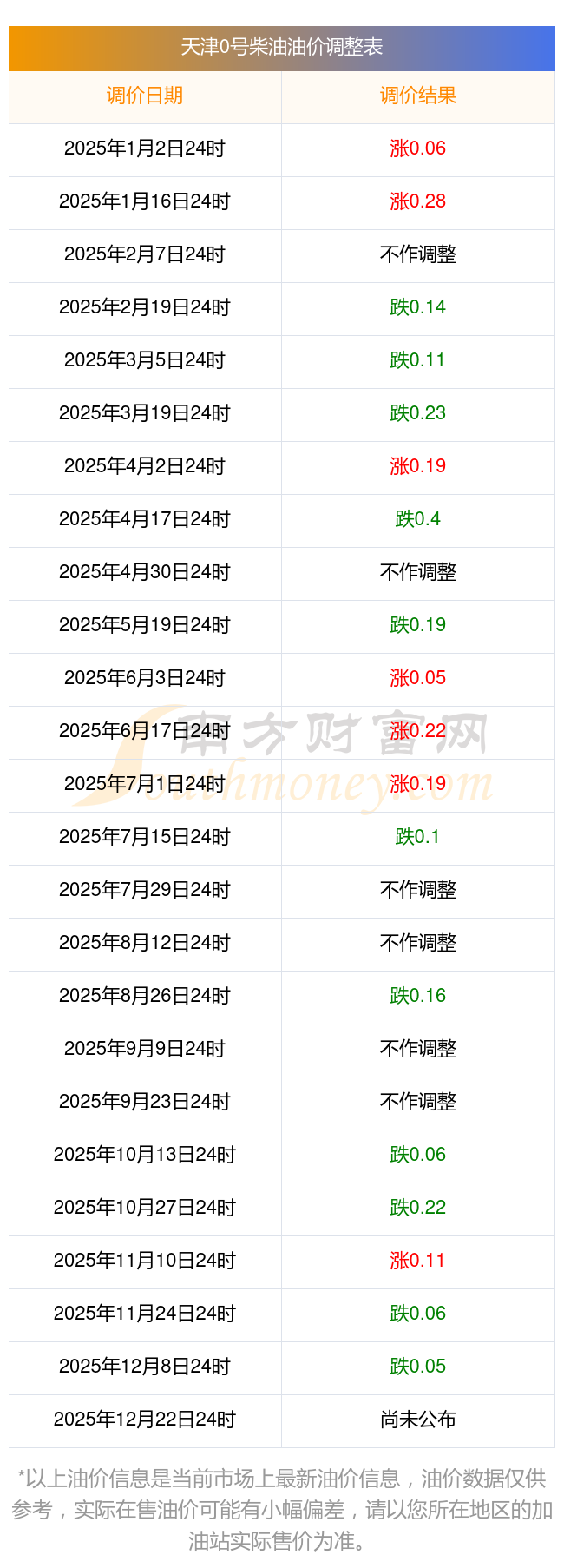 12月18日的天津汽油、柴油每升最新價格(調整時間為12月9日):92號汽油為6.83元,下調了0.05元,下調幅達0.73%;95號汽油為7.22元,下調了0.04元,下調幅達0.55%;89號汽油為6.33元,下調了0.05元,下調幅達0.78%;0號柴油為6.47元,下調了0.05元,下調幅達0.77%。天津下一輪油價調整時間12月22日24時,距離現在還有4.58天。