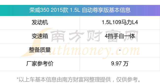 在動力方面,榮威350 2015款 1.5L 自動尊享版搭載的是一臺1.5L109馬力L4自然吸氣發(fā)動機,匹配4擋手自一體自動檔變速箱,燃料形式為汽油,廠家參考價9.97萬元。