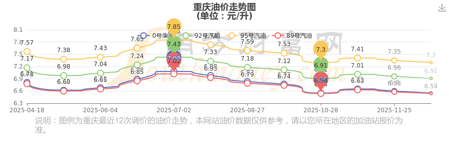重慶汽油、柴油12月18日每升的價(jià)格具體是(12月9日調(diào)整后的價(jià)格):92號(hào)汽油6.91元;95號(hào)汽油7.3元;89號(hào)汽油6.54元;0號(hào)柴油6.55元。