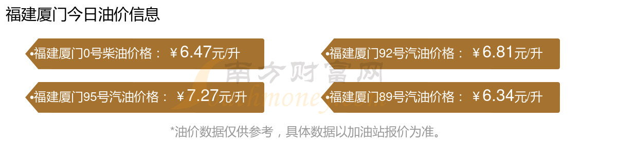福建廈門汽油、柴油12月18日每升最新價(jià)格為:0號(hào)柴油為6.47元,減了0.05元;95號(hào)汽油為7.27元;92號(hào)汽油為6.81元;89號(hào)汽油為6.34元,調(diào)整時(shí)間為12月9日。