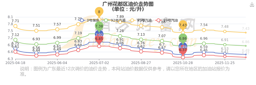 廣州花都區(qū)汽油、柴油12月18日每升的價格為:92號汽油6.86元;95號汽油7.43元;89號汽油6.37元;0號柴油6.49元,本次油價調(diào)整時間是12月9日。