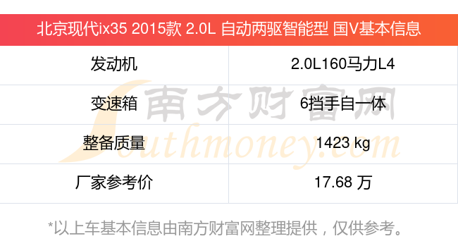 北京現(xiàn)代ix35 2015款 2.0L 自動(dòng)兩驅(qū)智能型 國(guó)V動(dòng)力上配備的是一臺(tái)2.0L160馬力L4自然吸氣發(fā)動(dòng)機(jī),匹配的是6擋手自一體自動(dòng)檔變速箱,燃料形式為汽油,常規(guī)整備質(zhì)量1423kg,廠家參考價(jià)17.68萬(wàn)元。