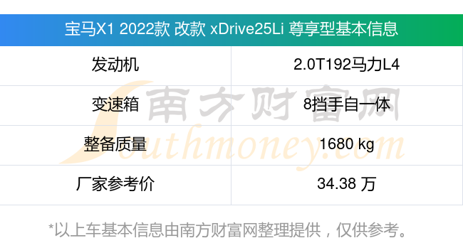寶馬X1 2022款 改款 xDrive25Li 尊享型動力上配備的是一臺2.0T192馬力L4渦輪增壓發(fā)動機,匹配的是8擋手自一體自動檔變速箱,燃料形式為汽油,常規(guī)整備質(zhì)量1680kg,廠家參考價34.38萬元。