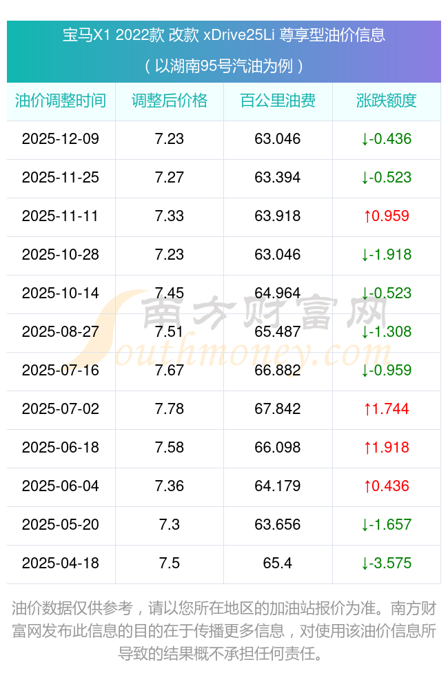根據(jù)12月9日95號汽油最新調(diào)整價格7.23元/升來計算(以湖南為例),該車型每百公里的平均油費是63.046元,上一輪11月25日調(diào)整價格7.27元每升來計算,每百公里的平均油費是63.394元,對比上一輪少花0.436元,下一輪的油價調(diào)整時間是12月22日24時。