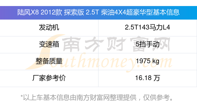 陸風(fēng)X8 2012款 探索版 2.5T 柴油4X4超豪華型動力上搭載的是一臺2.5T143馬力L4渦輪增壓發(fā)動機,匹配5擋手動擋變速箱,燃料形式為柴油,常規(guī)整備質(zhì)量1975kg,廠家參考價16.18萬元。