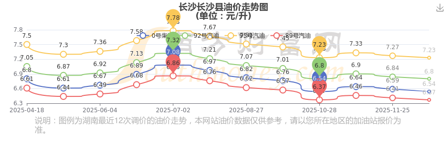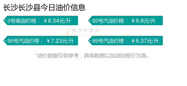 長沙長沙縣汽油、柴油12月18日每升最新價格為:0號柴油為6.54元,跌了0.05元;95號汽油為7.23元;92號汽油為6.8元;89號汽油為6.37元,調整時間為12月9日。
