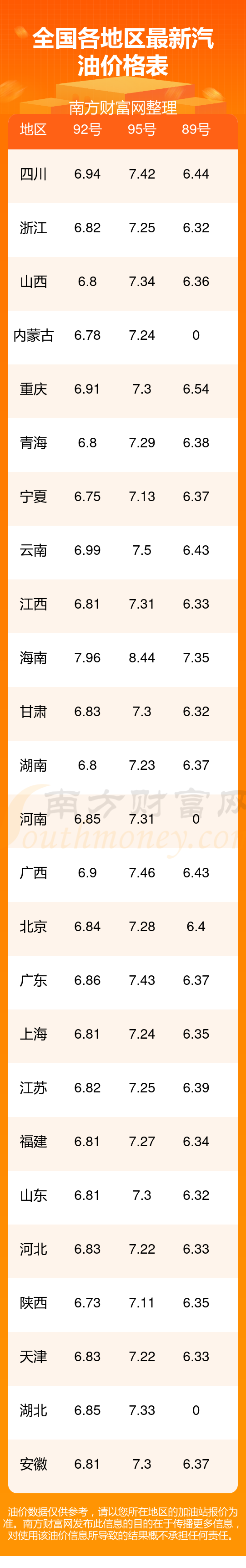全國(guó)92號(hào)汽油平均價(jià)格為:7元每升,其中,最低為陜西,價(jià)格6.73元/升,最高為海南,價(jià)格7.96元/升。