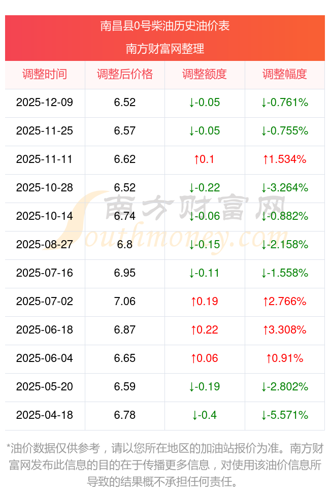 南昌縣0號(hào)柴油歷史油價(jià)表