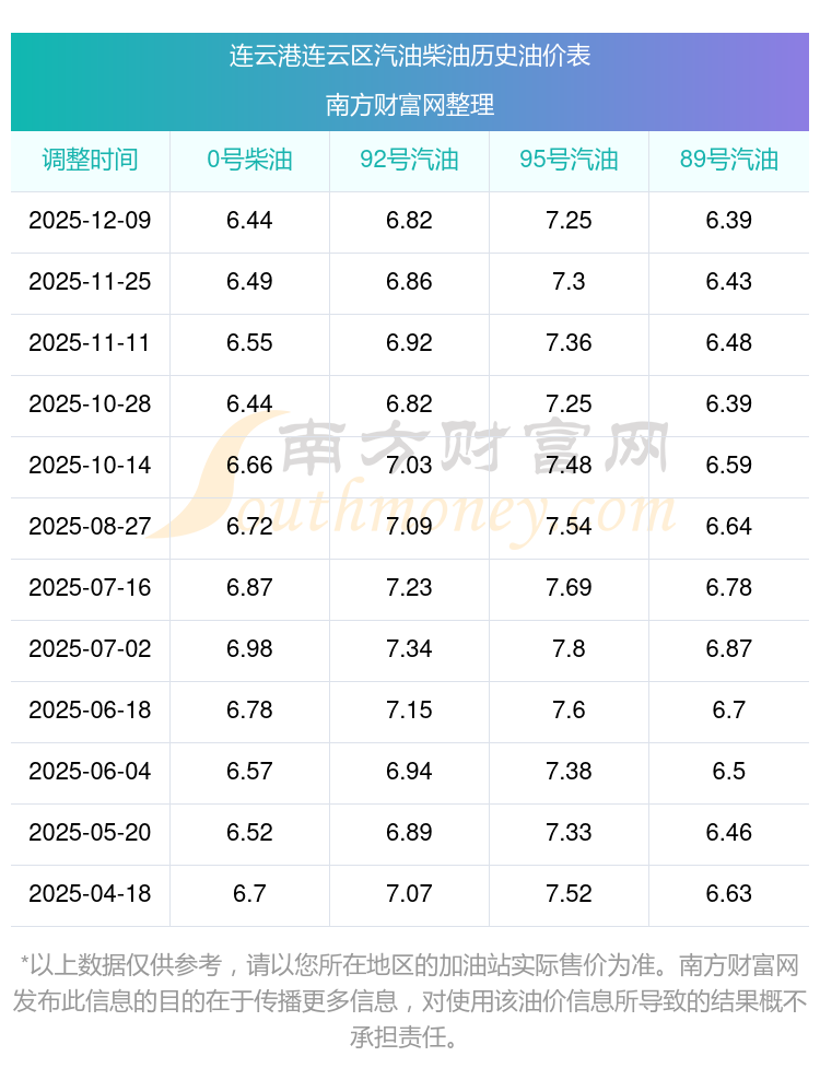 12月18日連云港連云區(qū)汽油每升的價(jià)格為12月9日調(diào)整后的價(jià)格,具體價(jià)格如下:92號(hào)汽油6.82元;95號(hào)汽油7.25元;89號(hào)汽油6.39元;0號(hào)柴油6.44元。