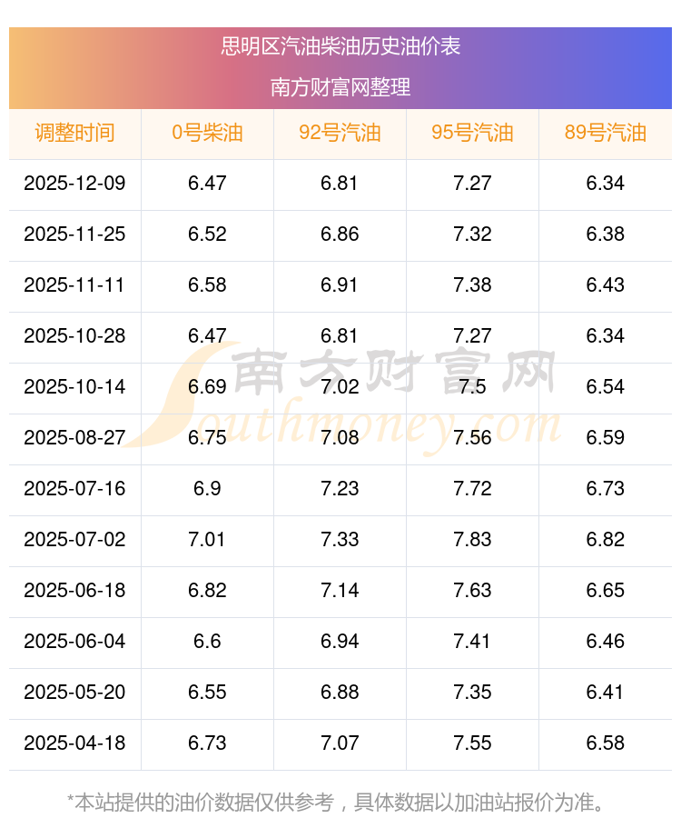 12月18日,思明區(qū)汽油、柴油價(jià)格多少錢一升?具體為:12月9日調(diào)整后,92號(hào)汽油為6.81元,跌了0.05元,跌幅達(dá)0.73%;95號(hào)汽油為7.27元,跌了0.05元,跌幅達(dá)0.68%;89號(hào)汽油為6.34元,跌了0.04元,跌幅達(dá)0.63%;0號(hào)柴油為6.47元,跌了0.05元,跌幅達(dá)0.77%。