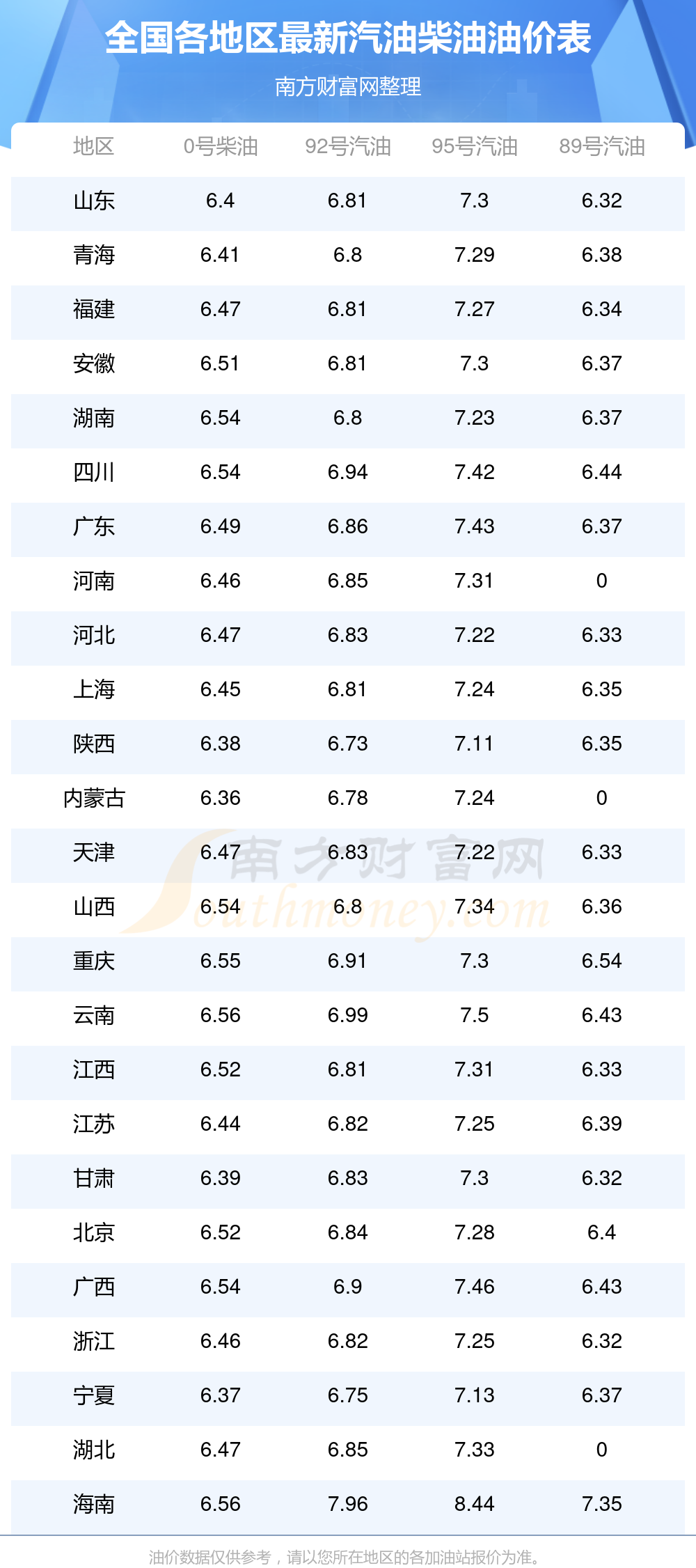 油價數(shù)據(jù)僅供參考,請以您所在地區(qū)的加油站報價為準(zhǔn)。南方財富網(wǎng)發(fā)布此信息的目的在于傳播更多信息,對使用該油價信息所導(dǎo)致的結(jié)果概不承擔(dān)任何責(zé)任。