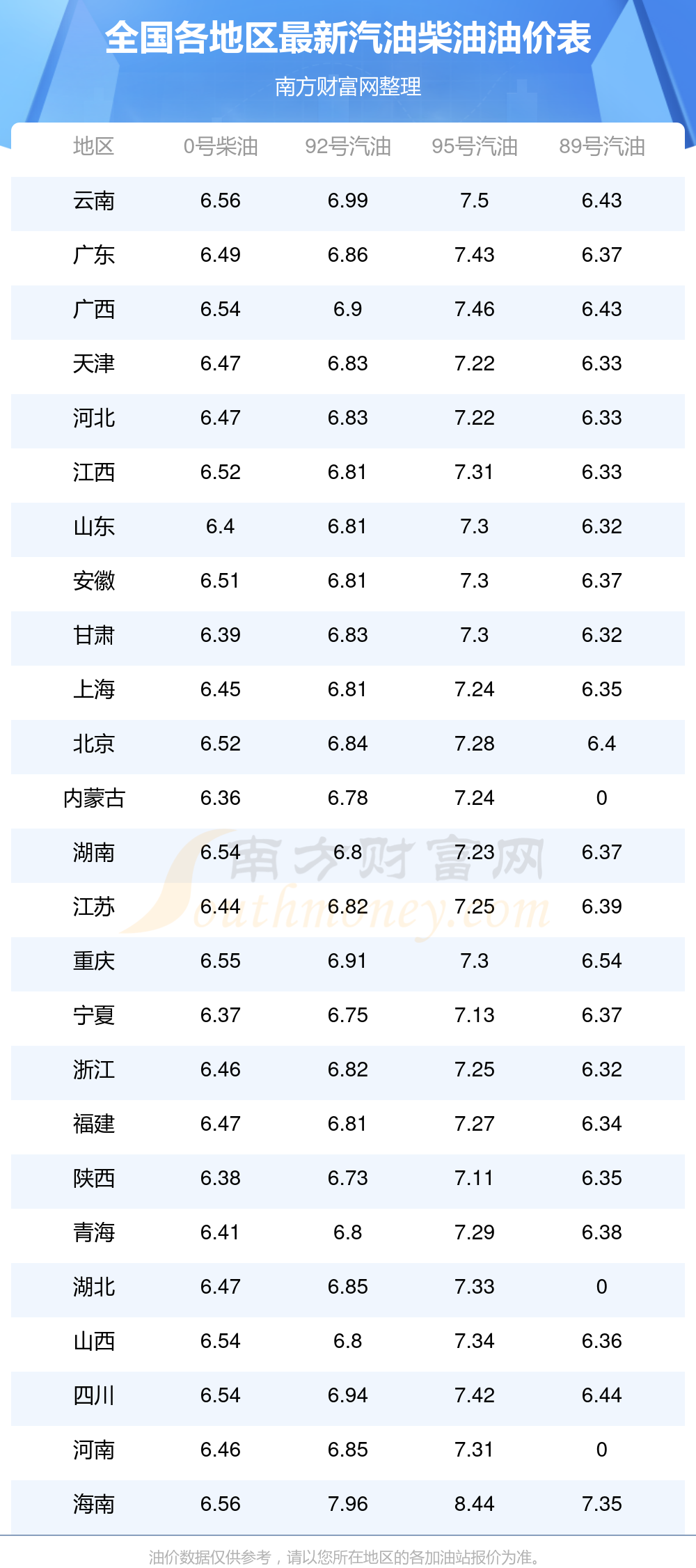 本次油價的調(diào)整時間為12月9日,調(diào)整后全國油價詳情為:92號汽油平均價格為7元每升,其中,最低的是陜西,6.73元每升,最高的是海南,7.96元每升。95號汽油平均價格為7元每升,其中,最低的是陜西,7.11元每升,最高的是海南,8.44元每升。0號柴油平均價格為:6元每升,其中,最低的是內(nèi)蒙古,6.36元每升,最高的是海南,6.56元每升。89號汽油平均價格為6元每升,其中,最低的是浙江,6.32元每升,最高的是海南,7.35元每升。下一輪油價調(diào)整時間12月22日24時,距離現(xiàn)在還有4.51天。