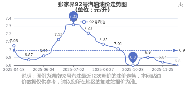 張家界92號汽油12月18日的最新價格:12月9日油價調(diào)整后,張家界92號汽油6.8元/升,相對上次調(diào)整時間11月25日的油價6.84元每升,下降了0.04元,下降0.639%。