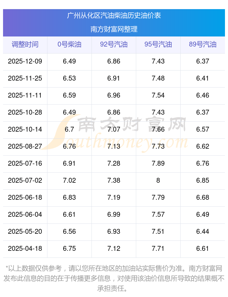 廣州從化區(qū)歷史油價表