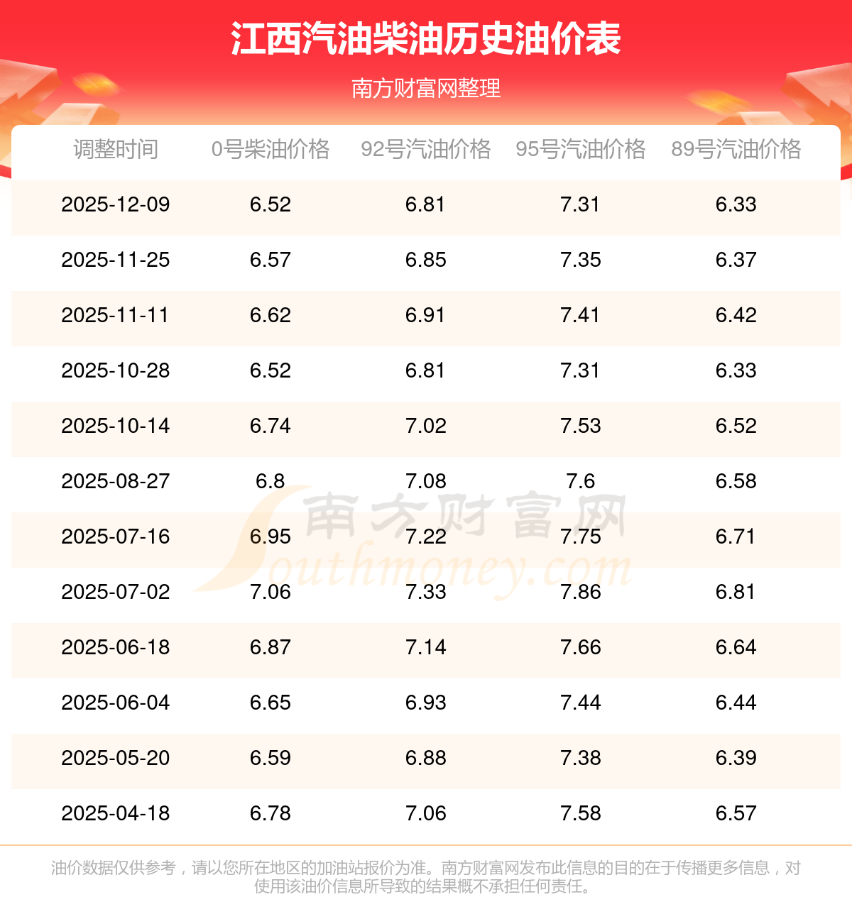 江西2025年最新汽油柴油歷史油價表