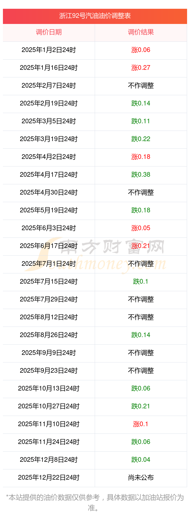 12月18日,浙江92號汽油的價格是6.82元每升,本次的調(diào)整時間為12月9日,對比上次的調(diào)整下降了0.04元,下降0.583%,下次調(diào)整時間為12月22日24時,還有4.45天。