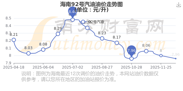 12月18日,海南92號汽油的價格是7.96元/升,本輪油價調(diào)整時間是12月9日,11月25日為上一輪油價調(diào)整時間,上次調(diào)整后海南92號汽油價格為8元/升,本次相比下跌了0.04元,下跌幅為0.5%。