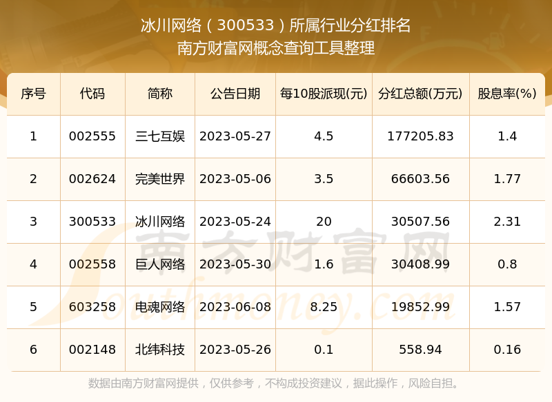 按照南方財(cái)富網(wǎng)趨勢選股系統(tǒng)統(tǒng)計(jì),冰川網(wǎng)絡(luò)所屬行業(yè)為網(wǎng)絡(luò)游戲行業(yè),網(wǎng)絡(luò)游戲行業(yè)分紅排名情況如下表: