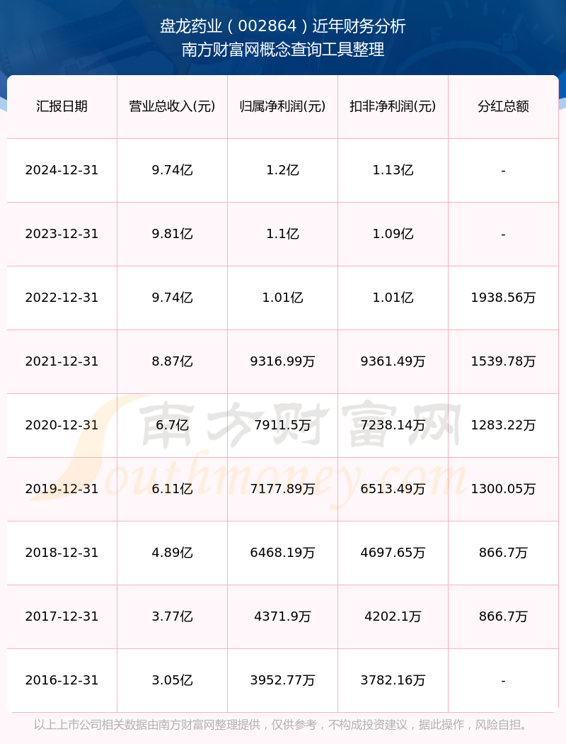 盤龍藥業(yè)公司2024年實(shí)現(xiàn)營(yíng)業(yè)收入9.74億元,同比增長(zhǎng)-0.71%;凈利潤(rùn)1.2億元,同比增長(zhǎng)8.91%;毛利率60.82%。