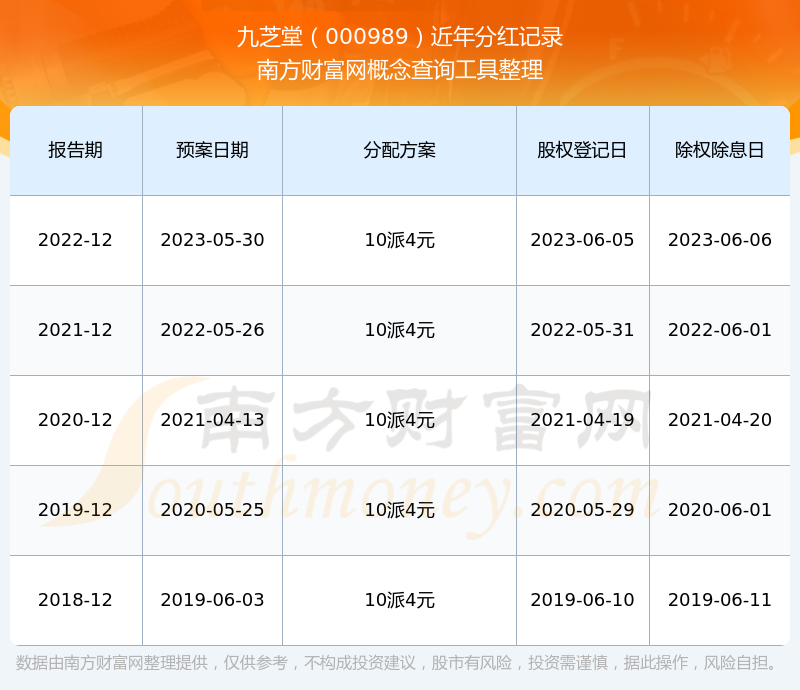 九芝堂最新一次公布的分紅方案為10派4元。本次權(quán)益分派股權(quán)登記日為2023年6月5日,除權(quán)除息日為2023年6月6日,派息日為2023年6月6日。